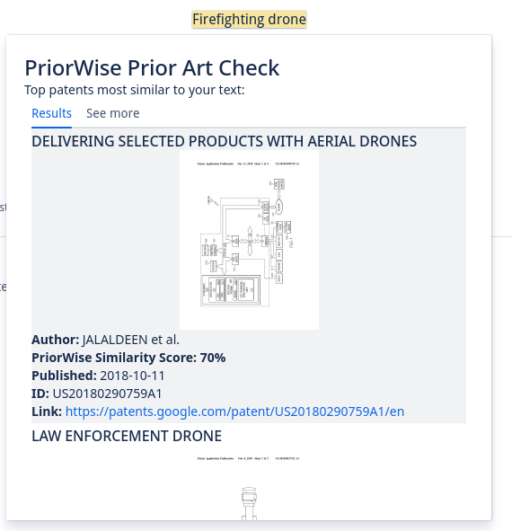 Example of a programmatically generated list of patents returned in an inline modal from PriorWise