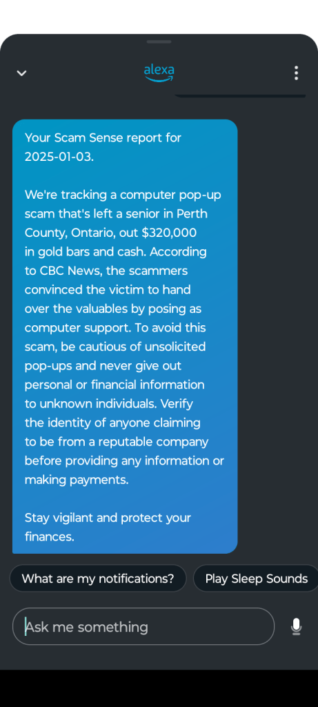 In an increasingly connected world, scams and fraud have become more sophisticated, targeting vulnerable individuals with alarming frequency. Seniors, often less familiar with digital tactics, are particularly at risk. That’s why I created ScamSense — an Alexa skill designed to educate, inform, and empower seniors to recognize and avoid scams.