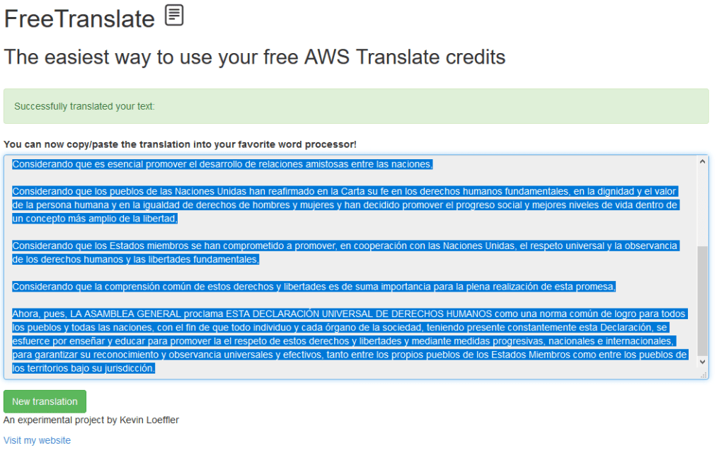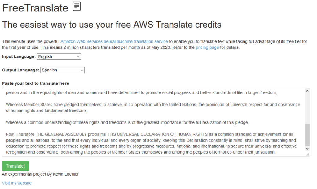 Amazon Web Services offers a product called Amazon Translate, which is a neural machine translation service available for application developers and data scientists. It lets users translate between 55 different languages leveraging an advanced machine learning tool. But what if you’re not a programmer? FreeTranslate is a free program you can deploy to Amazon with the click of a button!