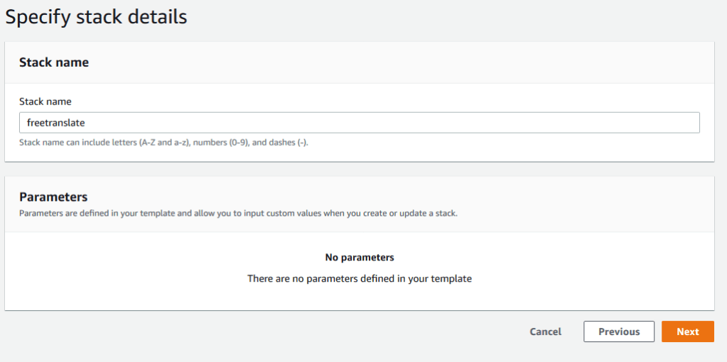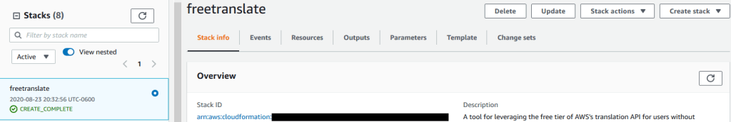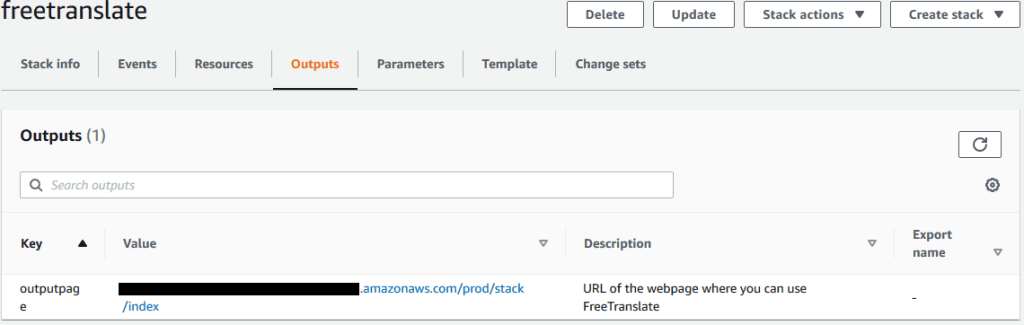 On the Outputs page you will see a URL ending with “.amazonaws.com/prod/stack/index”. Open this link in your browser as it goes to your personal FreeTranslate webpage. I recommend you bookmark this page for easy access.